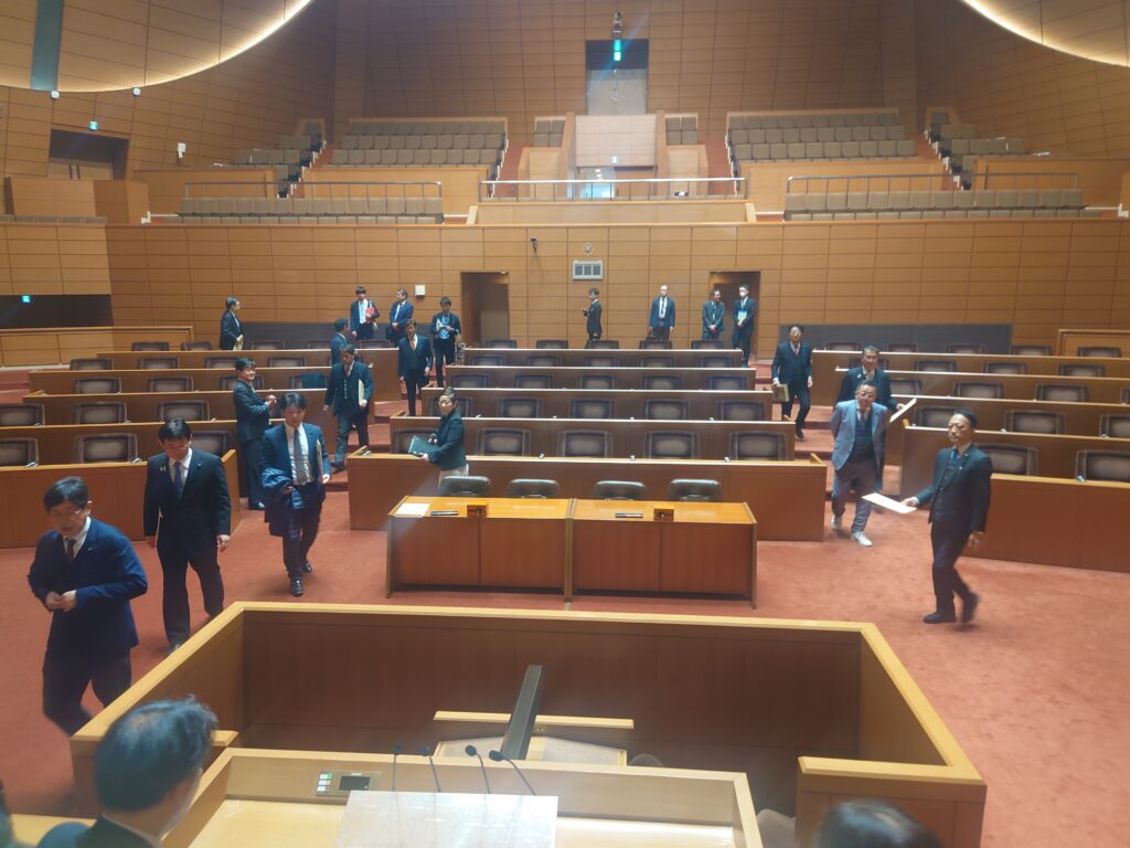 福岡県議会の本会議場は、愛知県ゆかりの建築家である黒川紀章先生が設計された建物で、独創性があり、非常に素晴らしい議場でした。バブル期に建設された建物ならではの風格も感じられました。